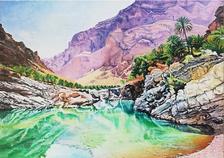 - نبذة عن العمل : منظر من ولاية قريات يتجسد فيه عمق المناظر الطبيعيه العمانيه وما يحتويها من جماليات وقيم في التنوع الشكلي والملمس واللوتي